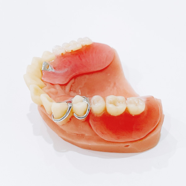 1本〜数本歯を失った場合に、周囲の歯へ金属のバネ(クラスプ)をかけて固定する入れ歯です。