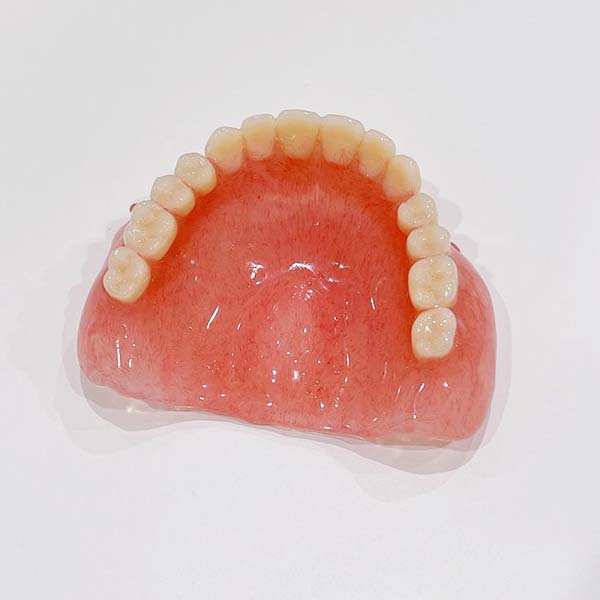 すべての歯を失った場合に作成します。吸盤のように粘膜と入れ歯の吸着で固定します。人工歯・義歯床ともにプラスチック(レジン製)からできています。適用範囲が広く、ほとんどの状態に使用が可能です。また樹脂でできているため、落として破損した場合なども修復がしやすいです。